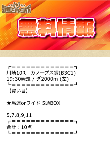 この日は川崎11Rで重賞「スパーキングサマーカップ」があったので現在高確中状態に突入している競馬ジャンボもこのレースの買い目を提供してくれるかと思ったら