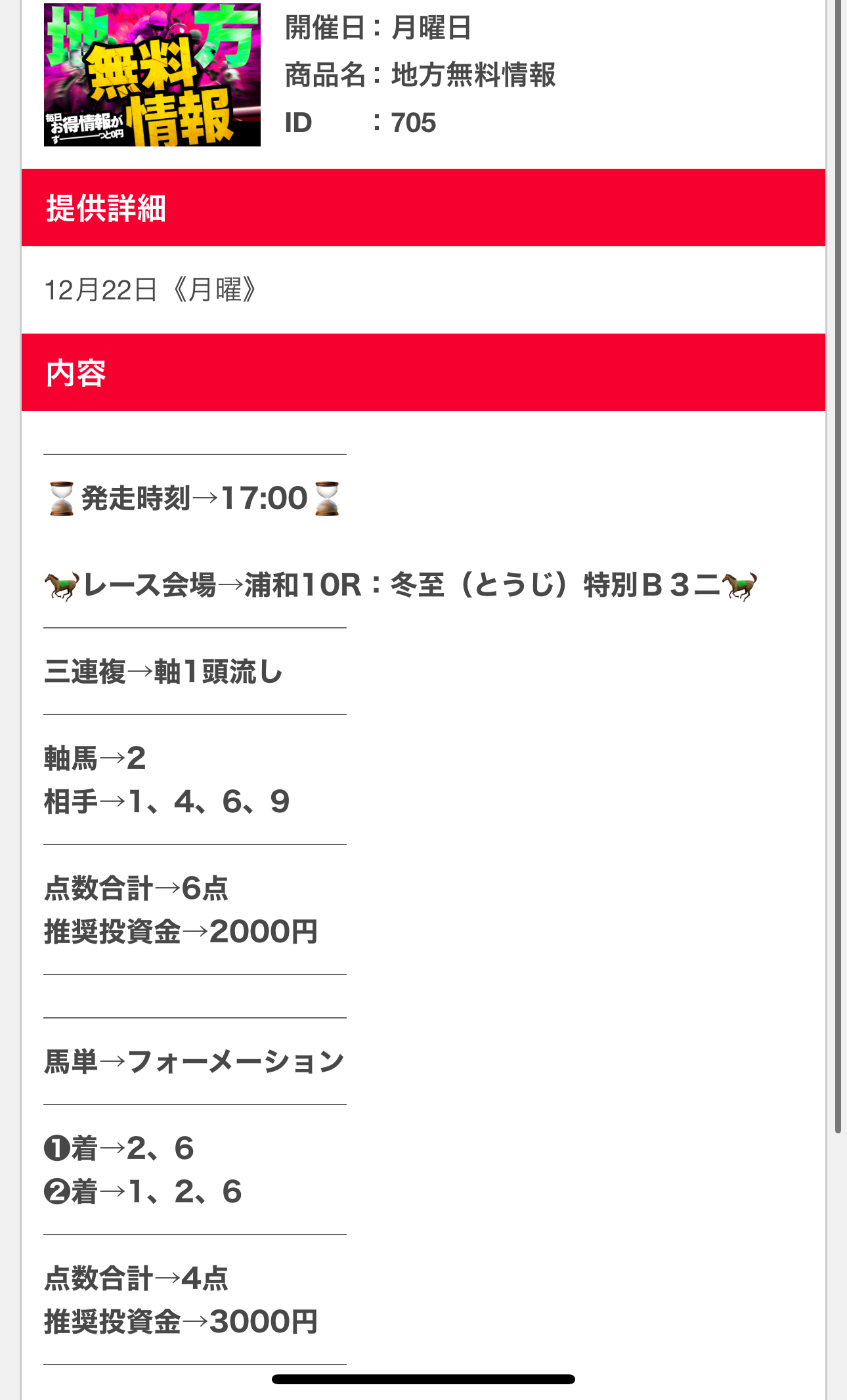 22日(月)の地方競馬無料予想で